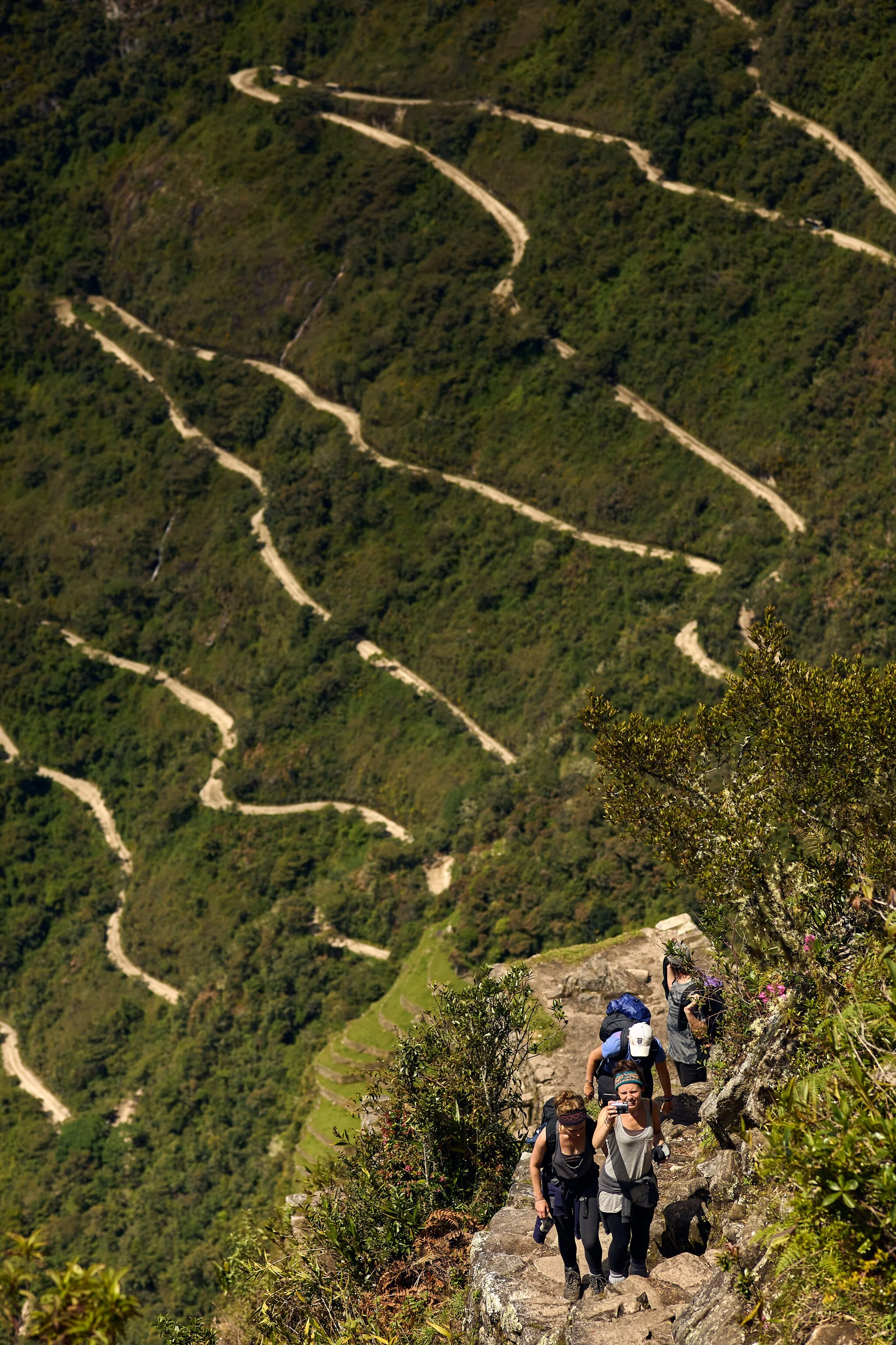 We woke up at 3:30 am or so. We had a slow start. The path was steep, very steep. Most of it was climbing stairs. Every hundred meters, the Machu Picchu trail intersected a dirt road.
